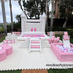 Make a statement with the Grand Luxe Play package! Our most popular option for larger parties and events. This setup transforms your venue into a premium play paradise, featuring an expansive assortment of soft play equipment designed to keep toddlers engaged for hours. Best for: 15–18 kids What’s Included: - A deluxe bounce house (10x10) - 1 Full and fun ball pit - 3 Climbers (small + 2 large) - Deluxe mats and safety fence - 3 Hoppers - 2 Banana rockers - 6 Soft play blocks - Safe and clean setup - Fenced play area for safety - Assembly, takedown, and sanitization service What’s Not Included: themed décor, bubble machine, white castle bounce house with ball pit, additional toys, generator, and event add-ons The white castle bounce house with ball pit is available for an additional $75. Colors Available: all white, white and pink, white and blue, white and beige. Delivery fee based on location - First 5 miles is free and $2/mile thereafter. Clients are responsible for providing a power source. If needed, generators are available to rent for an additional fee. For liability reasons, all generators must be rented directly through Lila Soft Play Rentals. PS: Our bookings are available all day and flexible to your event start and end time. If your date is not available, it means we have limited available. Please contact us to double check, we might still be able to accommodate your preferred event date.
